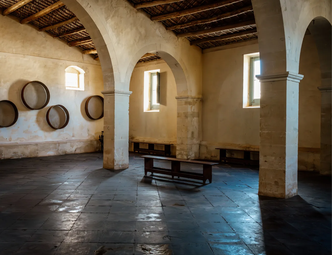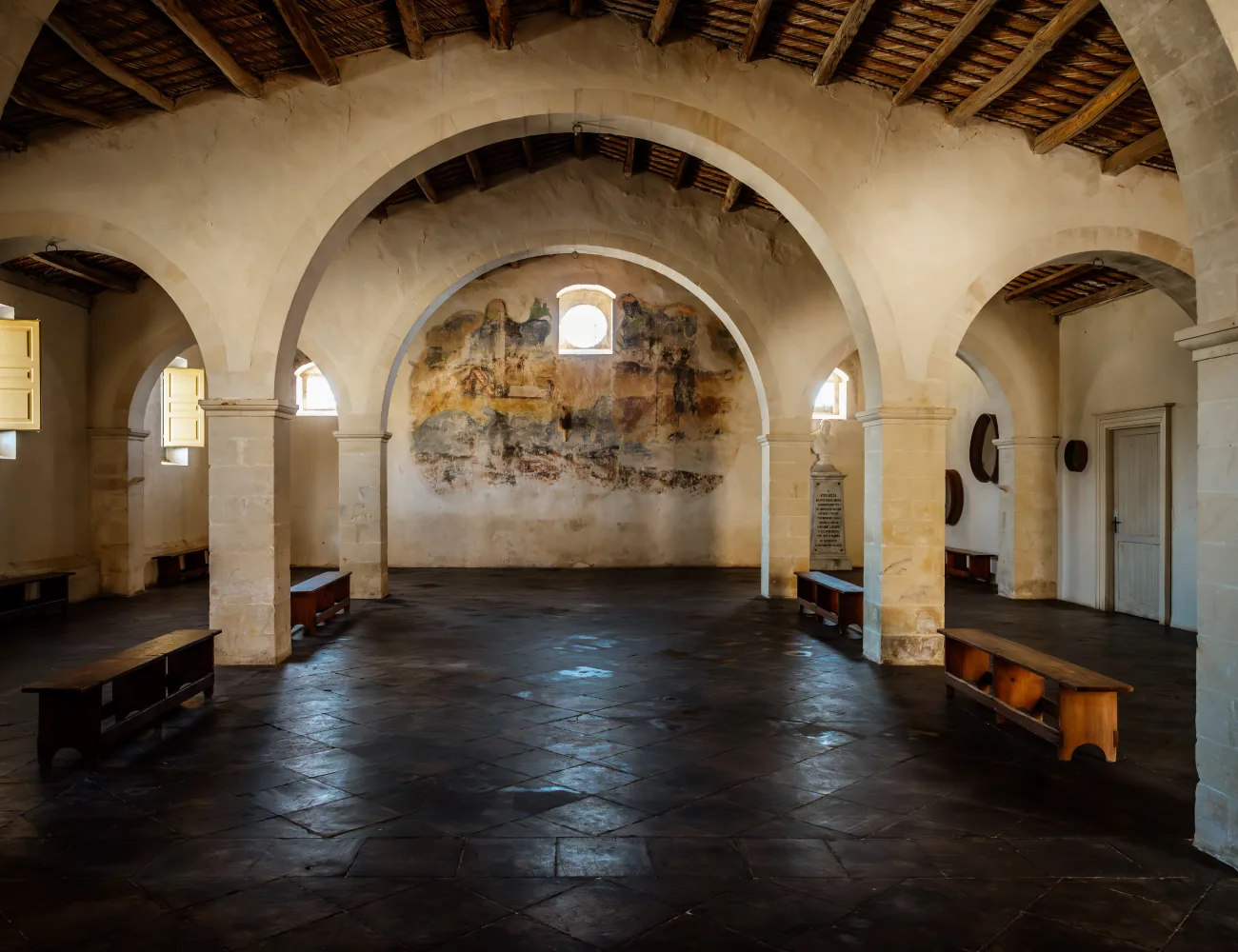 L’architettura a tre navate, il pavimento di pietra pece e la pittura murale sulla parete di fondo del granaio testimoniano la cura formale dedicata anche agli ambienti di lavoro, mentre gli strumenti dell’epoca, come setacci e misure per il grano, restituiscono la dimensione materiale delle attività legate alla produzione agricola.