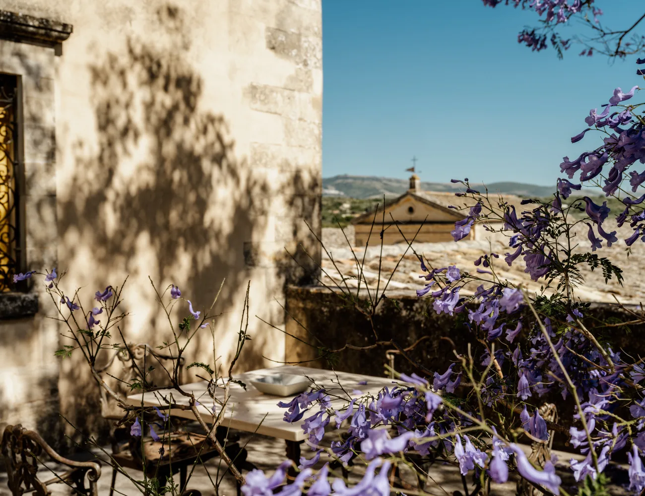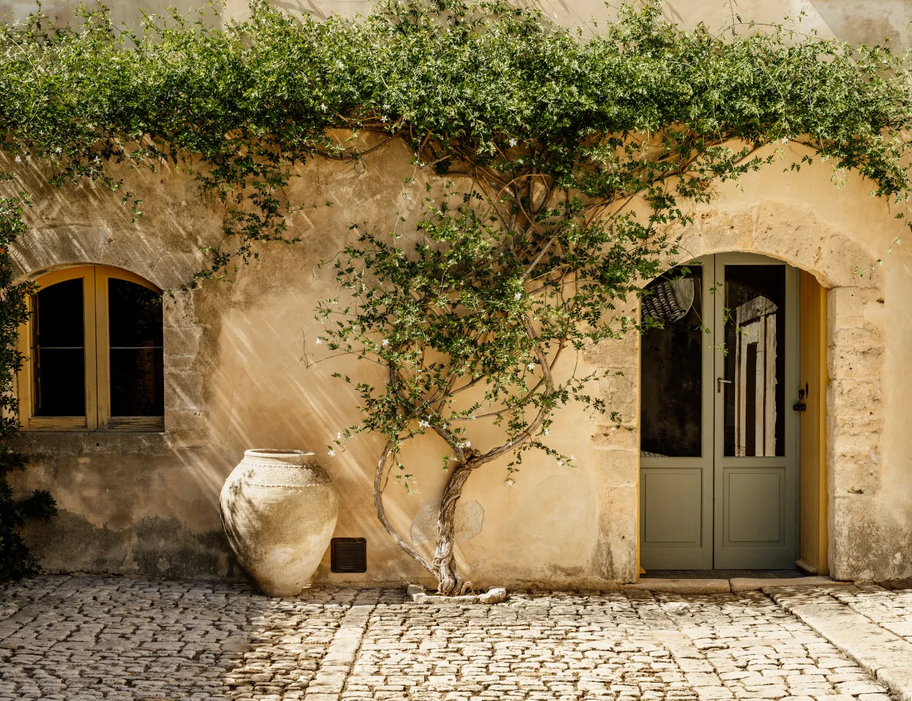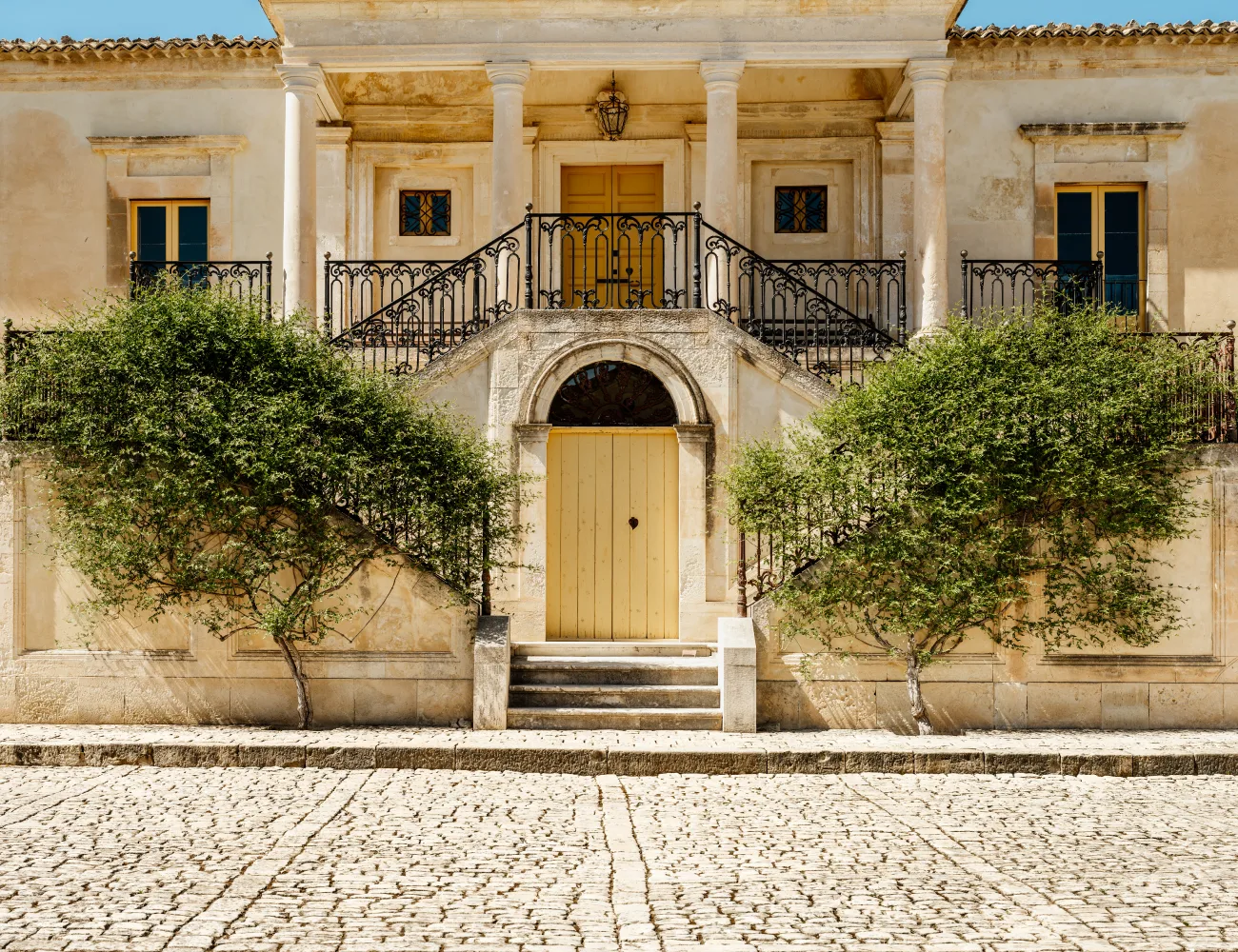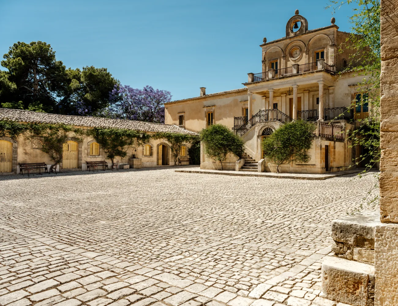 Il baglio principale, sul quale si affacciano la casa padronale e la chiesa, è di forma quadrangolare ed è delimitato da corpi di fabbrica simmetrici, un tempo destinati ad alloggi per i lavoranti. La pavimentazione originale in basole di pietra di Comiso riflette la luce del sole amplificando il senso di vastità e apertura dello spazio.