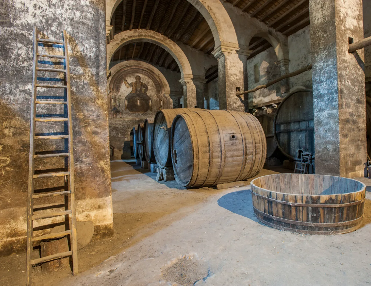 Enormi botti, le più grandi con una capacità di 150 ettolitri, trovano posto lungo le tre navate in cui si articola lo spazio e dimostrano la vastità della produzione vinicola dell’epoca. Sulla parete di fondo campeggia la raffigurazione di un uomo a cavallo di una botte, probabile omaggio ai proprietari di un tempo.