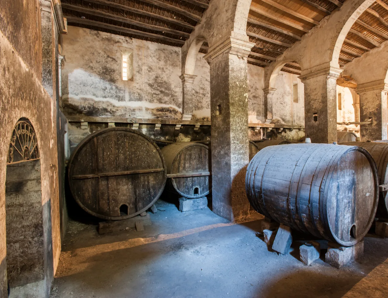 Sulla sinistra, perpendicolarmente al palmento, si apre la cantina, di straordinarie imponenza e bellezza.